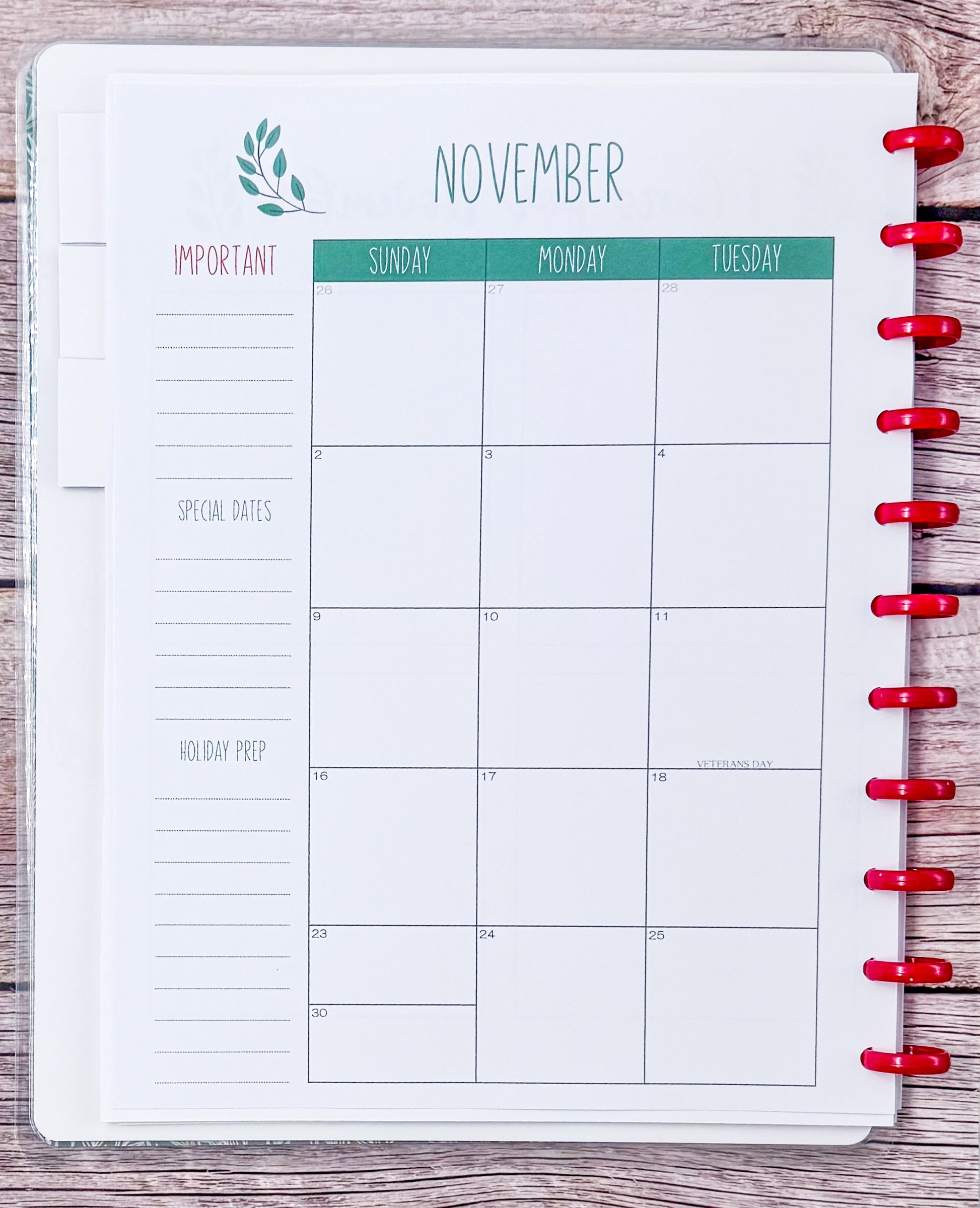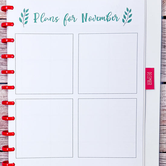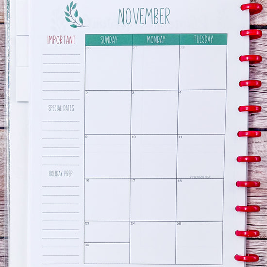 Spreads: Holiday Planning Section, Monthly, Monthly / Weekly Vertical, Monthly Planning and Reflection Pages (Beginning and End)