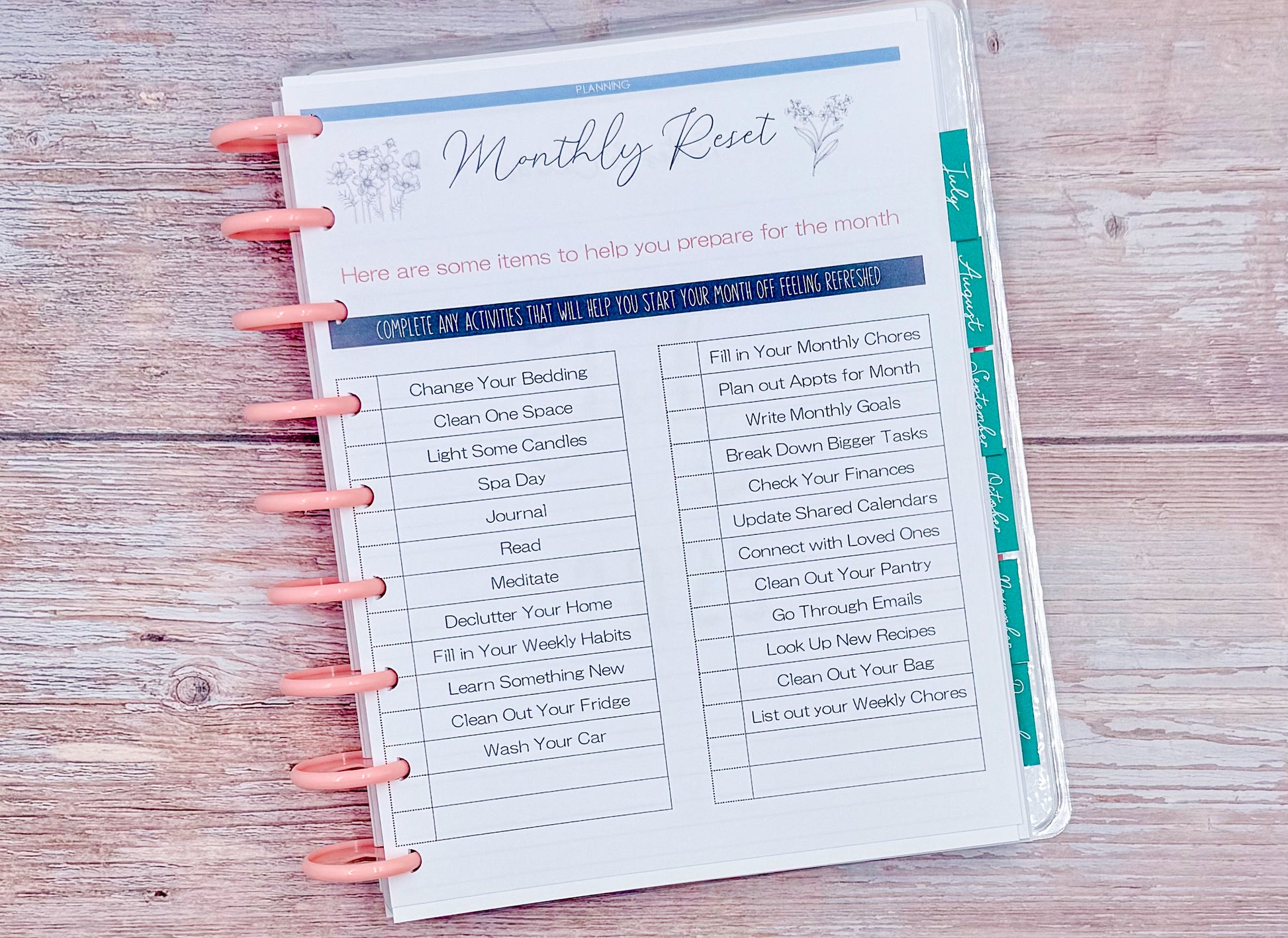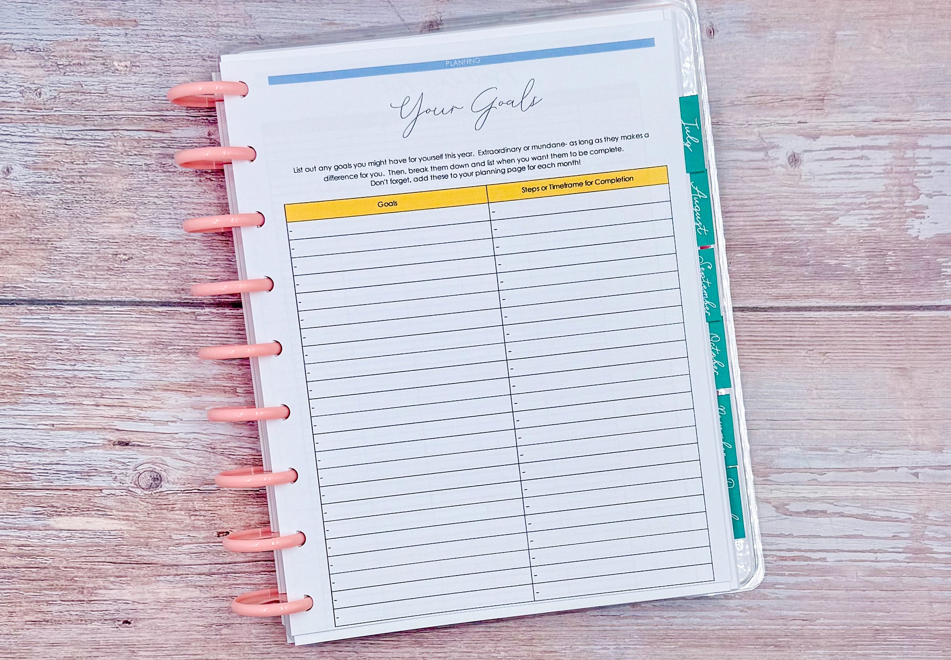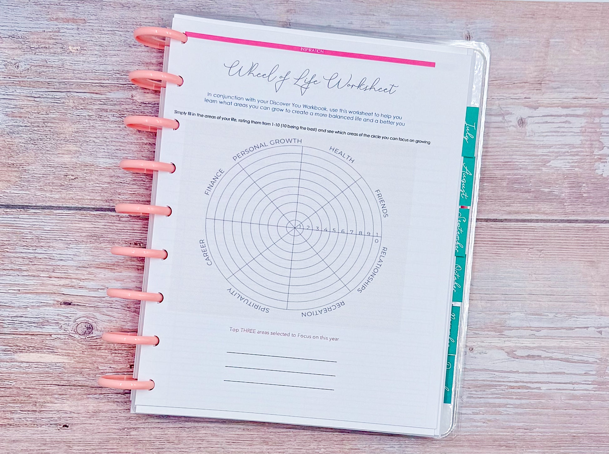 Spreads:Â Monthly, Monthly / Weekly Horizontal, Planning (Beginning and End) Pages, Discovery Workbook, Wheel of Life, Your Goals, Monthly Reset and MORE!Â