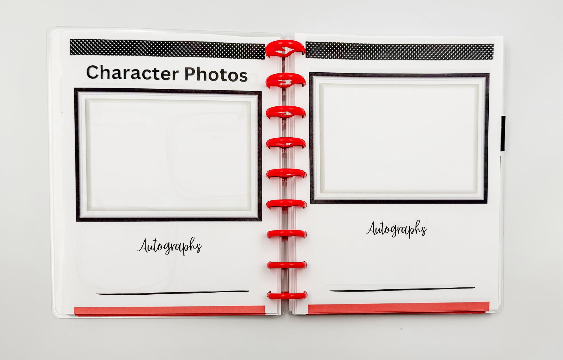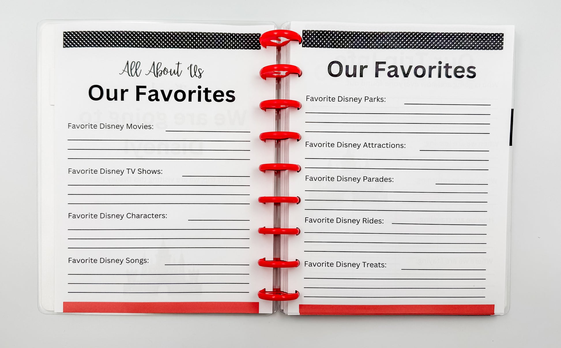 Spreads: Getting to know us, Packing, Planning, Arriving, Favorites for each day, Memories, Photos and Autographs for FOUR Trips!