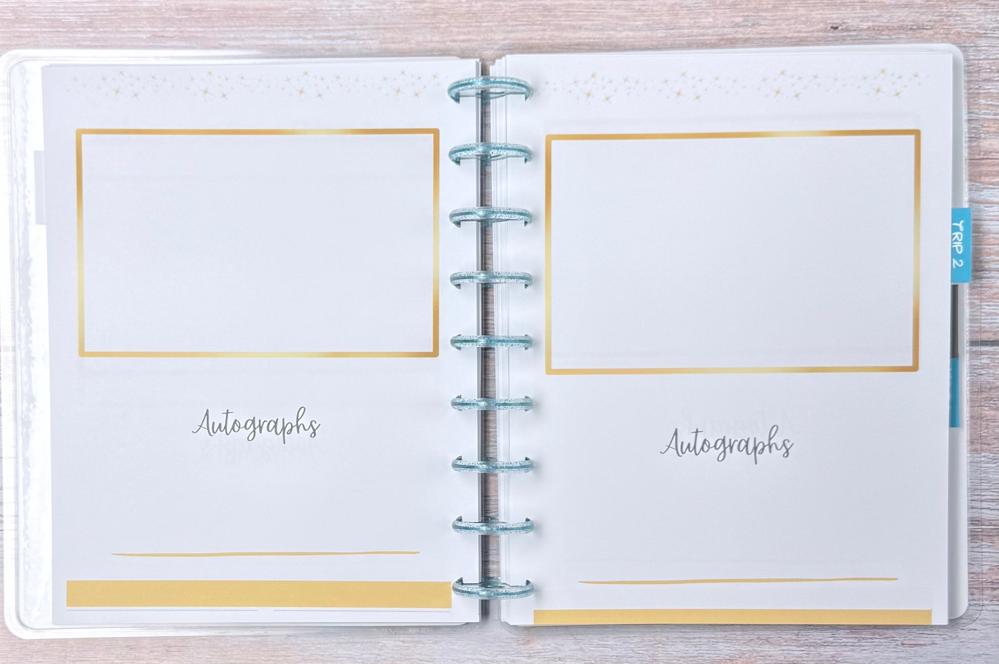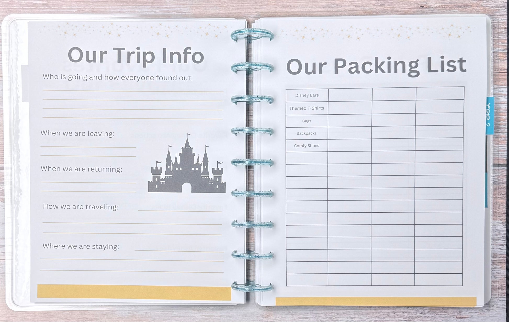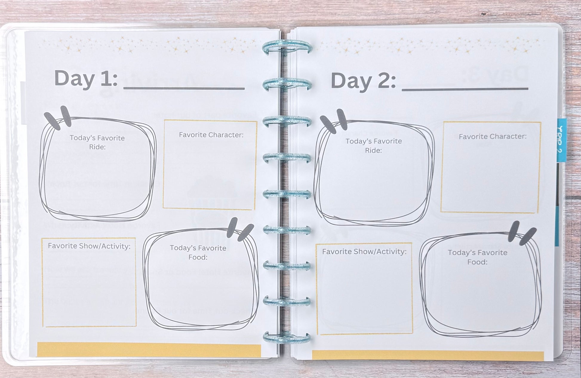 Spreads: Getting to know us, Packing, Planning, Arriving, Favorites for each day, Memories, Photos and Autographs for FOUR Trips!