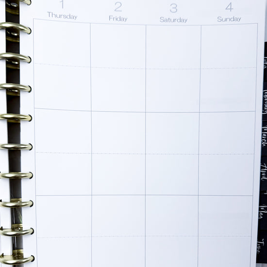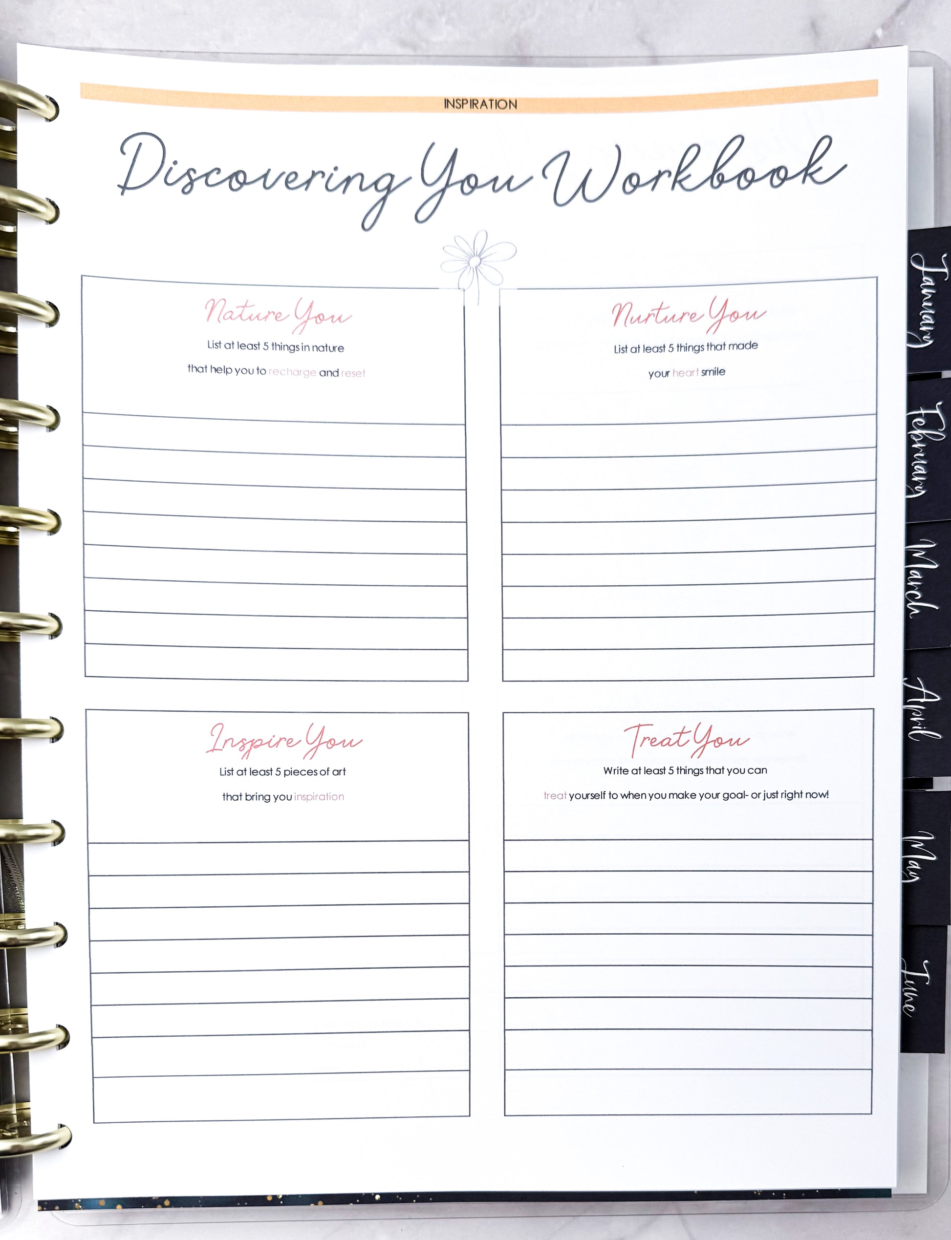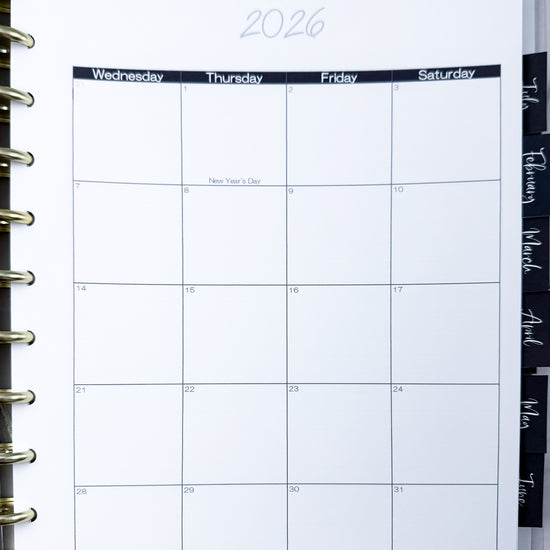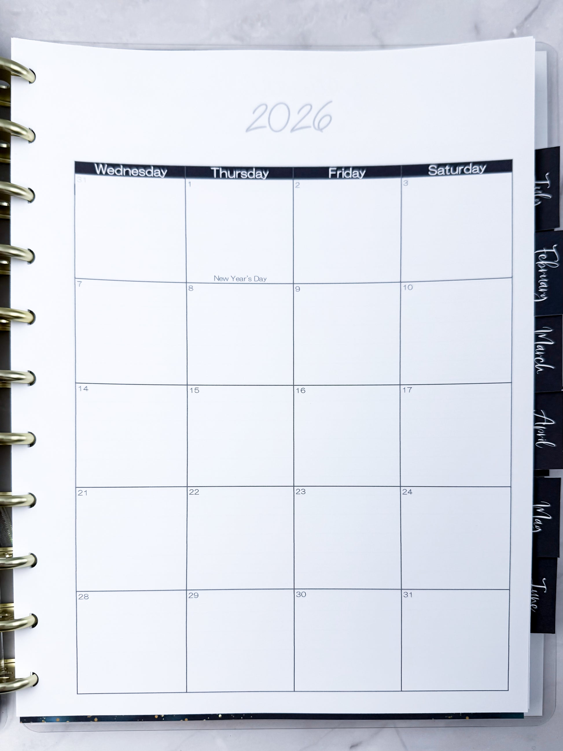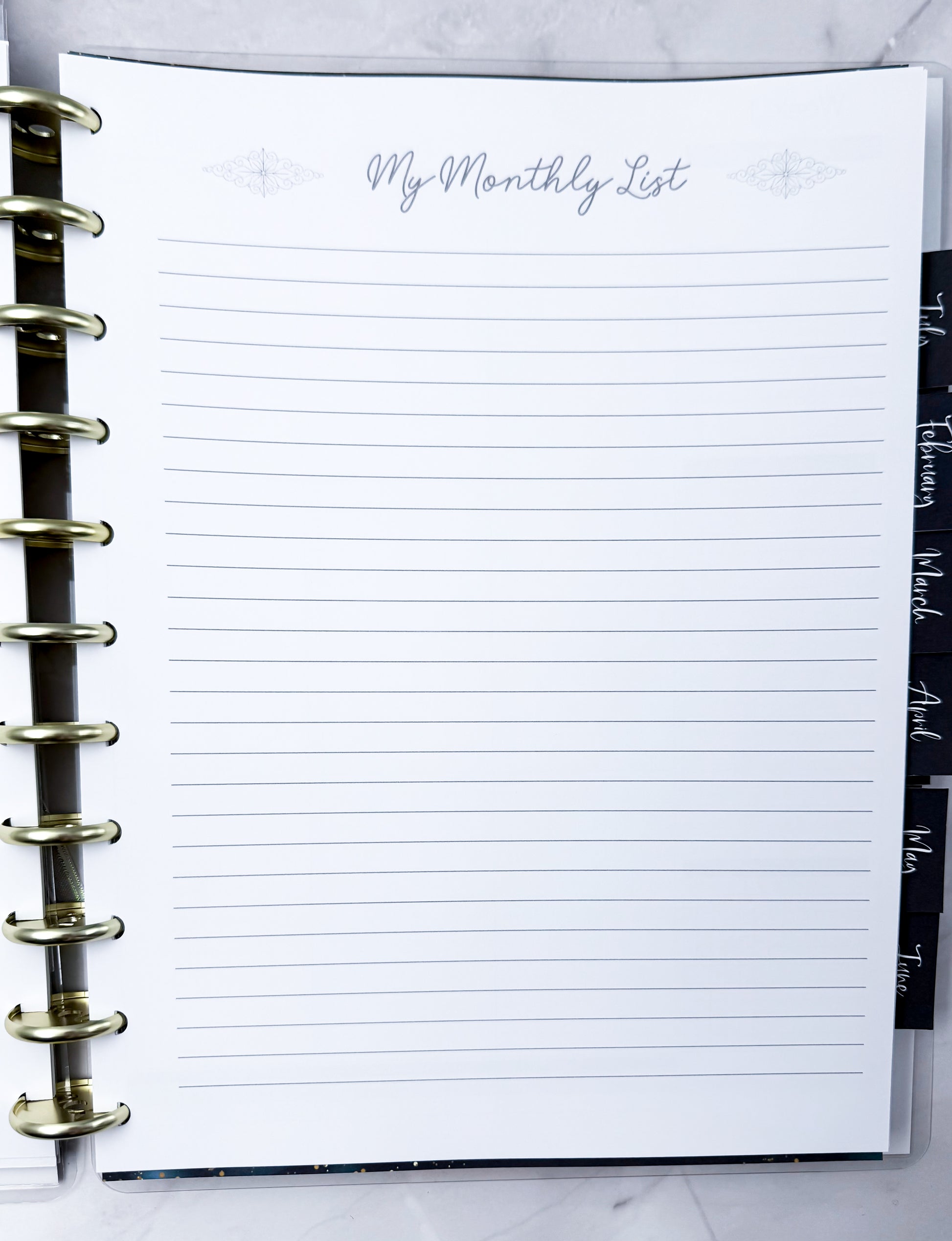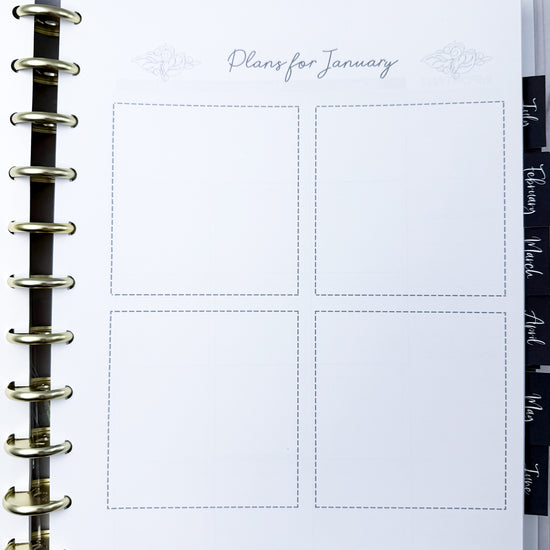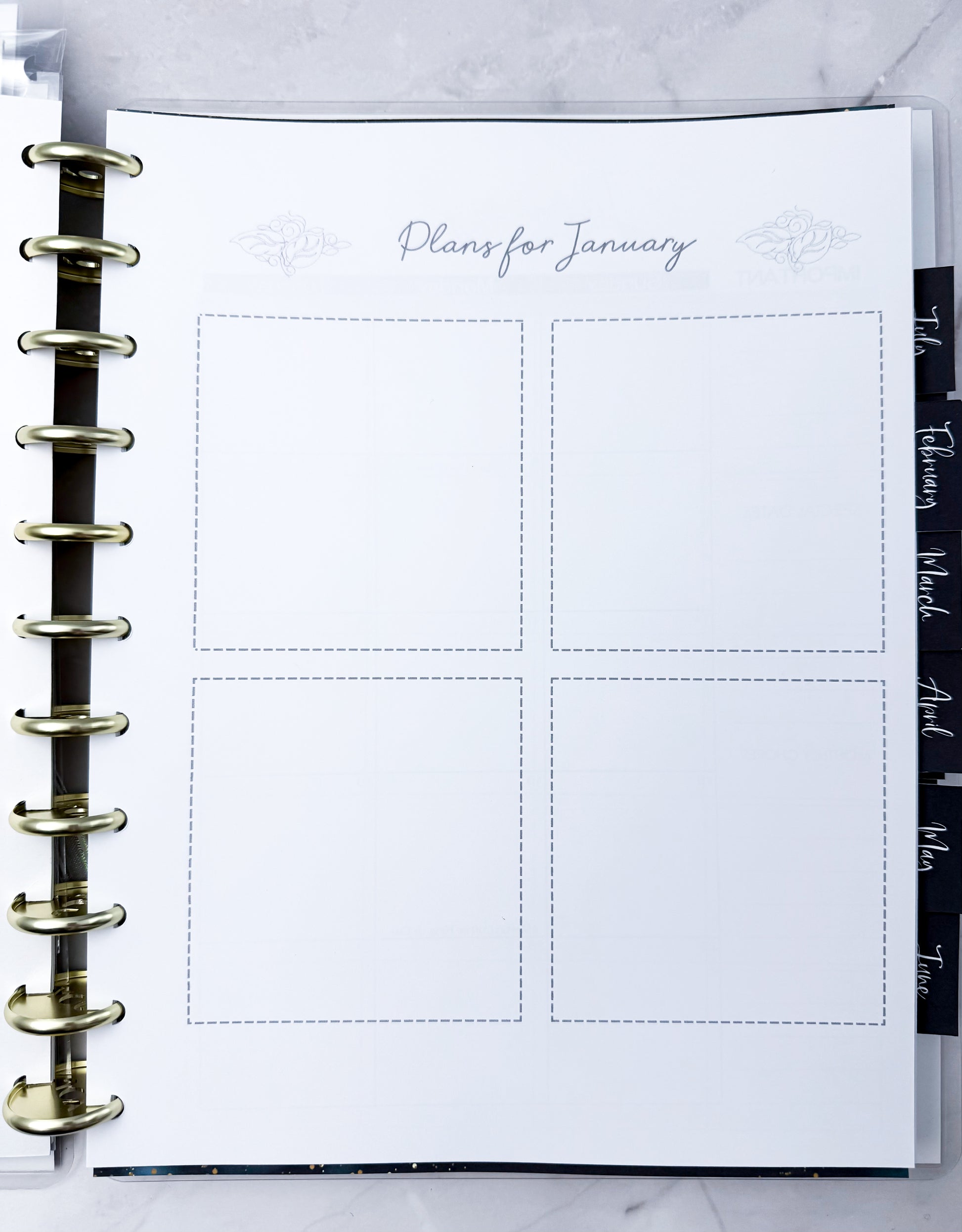 Spreads: Yearly Planning Workbook, Monthly Calendar, Monthly / Weekly Vertical, Monthly To Do Lists, Monthly Plans, Monthly Reflections