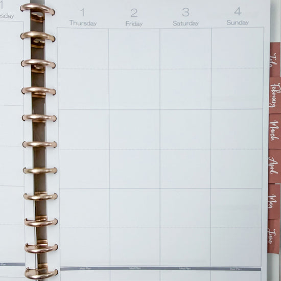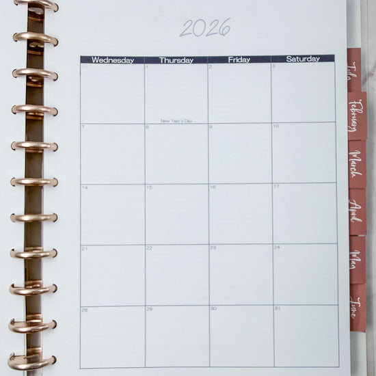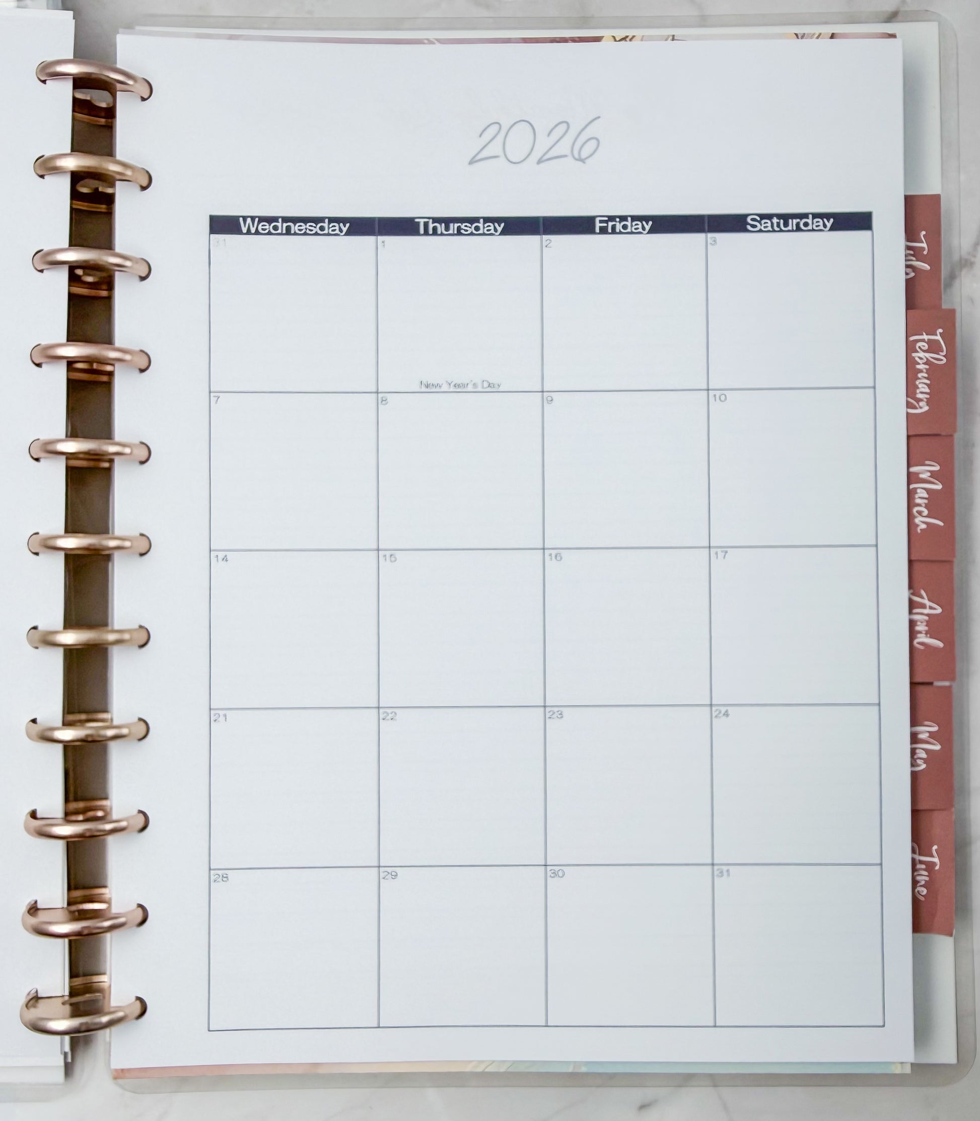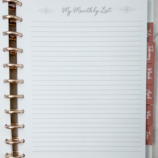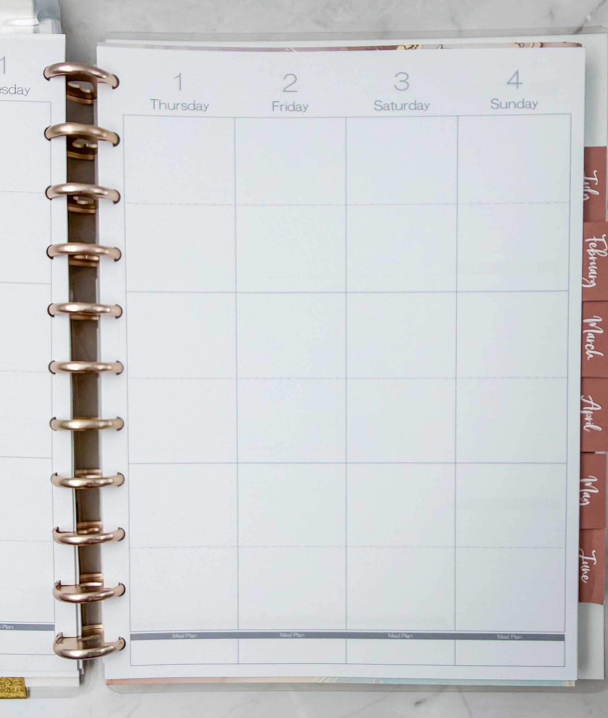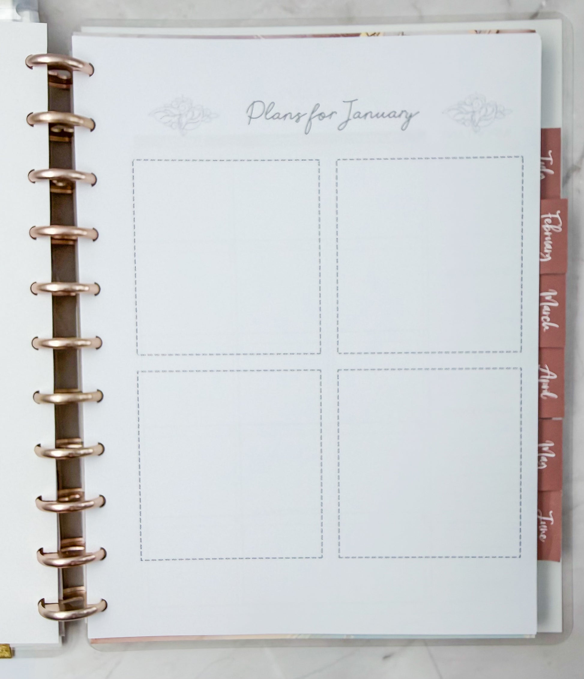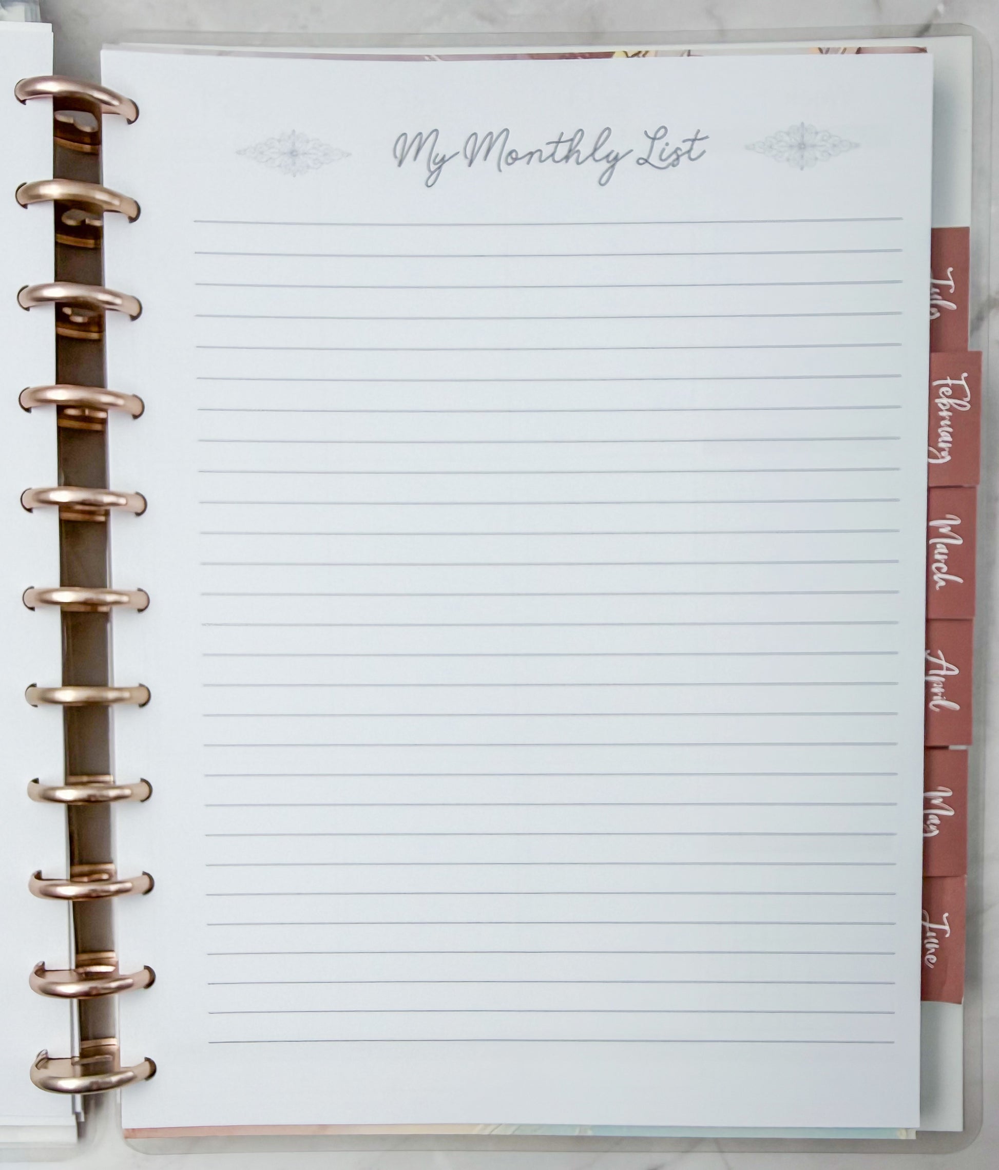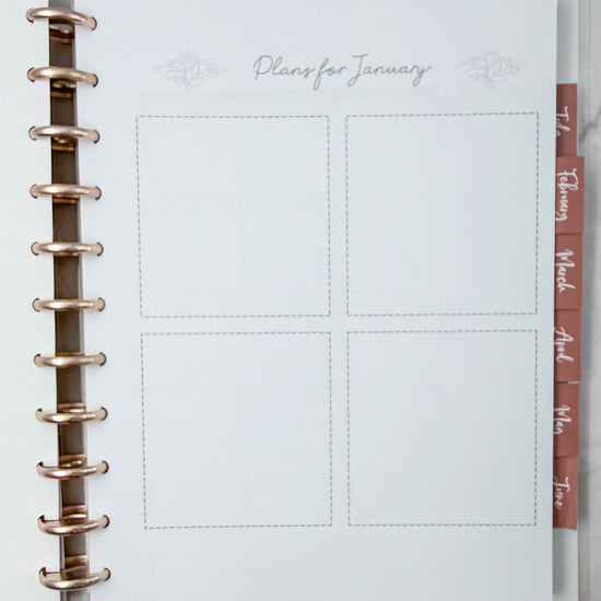 Spreads: Yearly Planning Workbook, Monthly Calendar, Monthly / Weekly Vertical, Monthly To Do Lists, Monthly Plans, Monthly Reflections