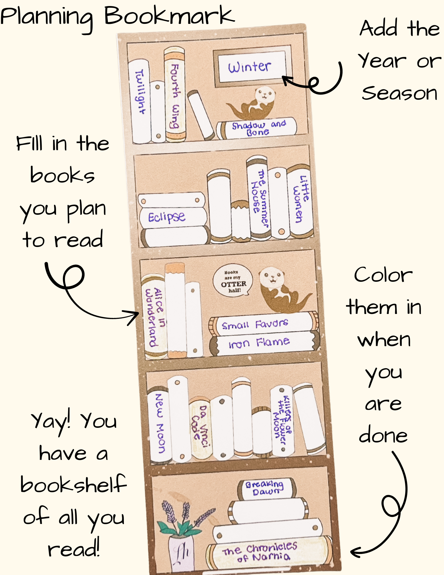 Simply fill in the Year / Season in the top frame. Write in the books you plan on reading and color them in when you are done!