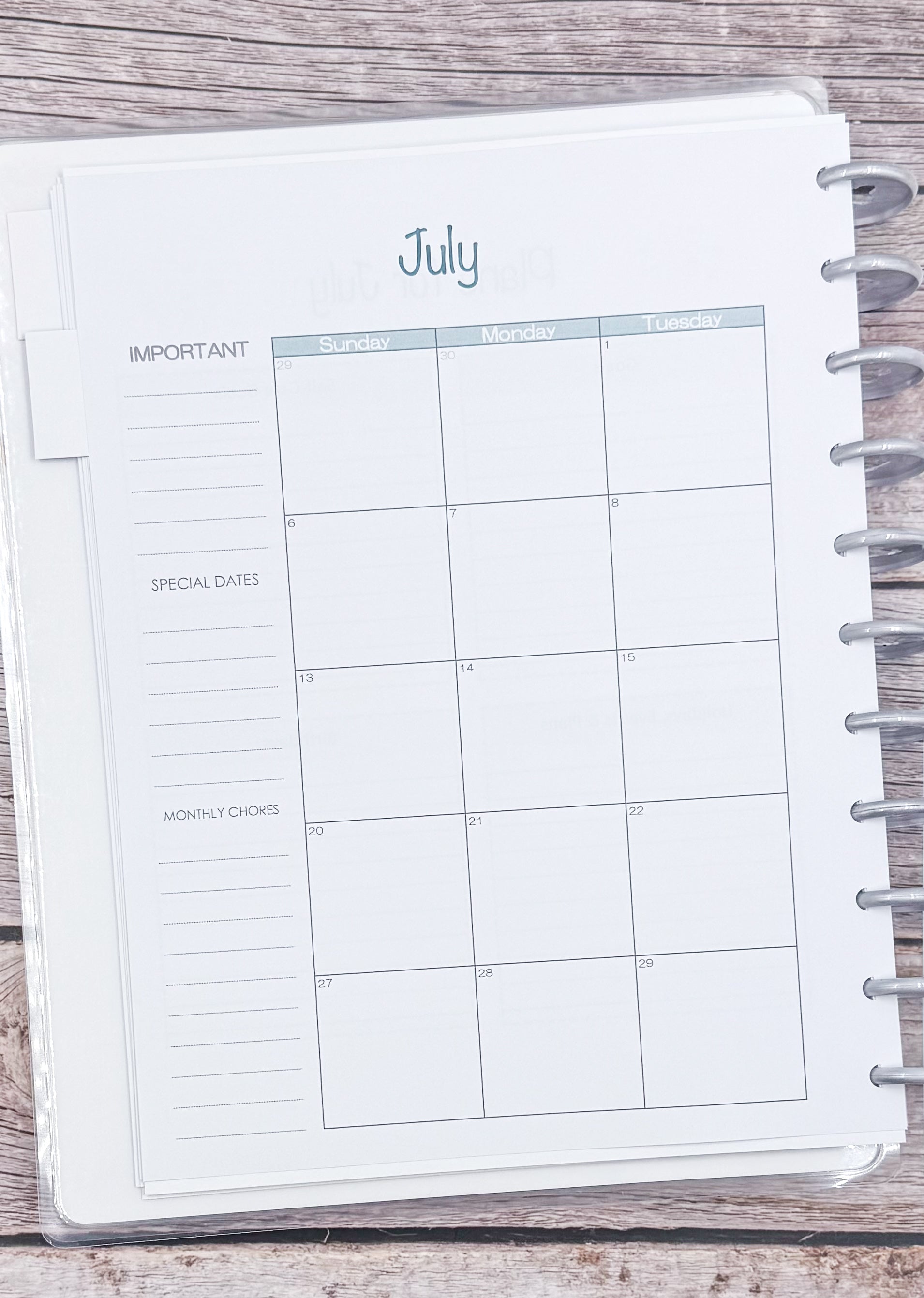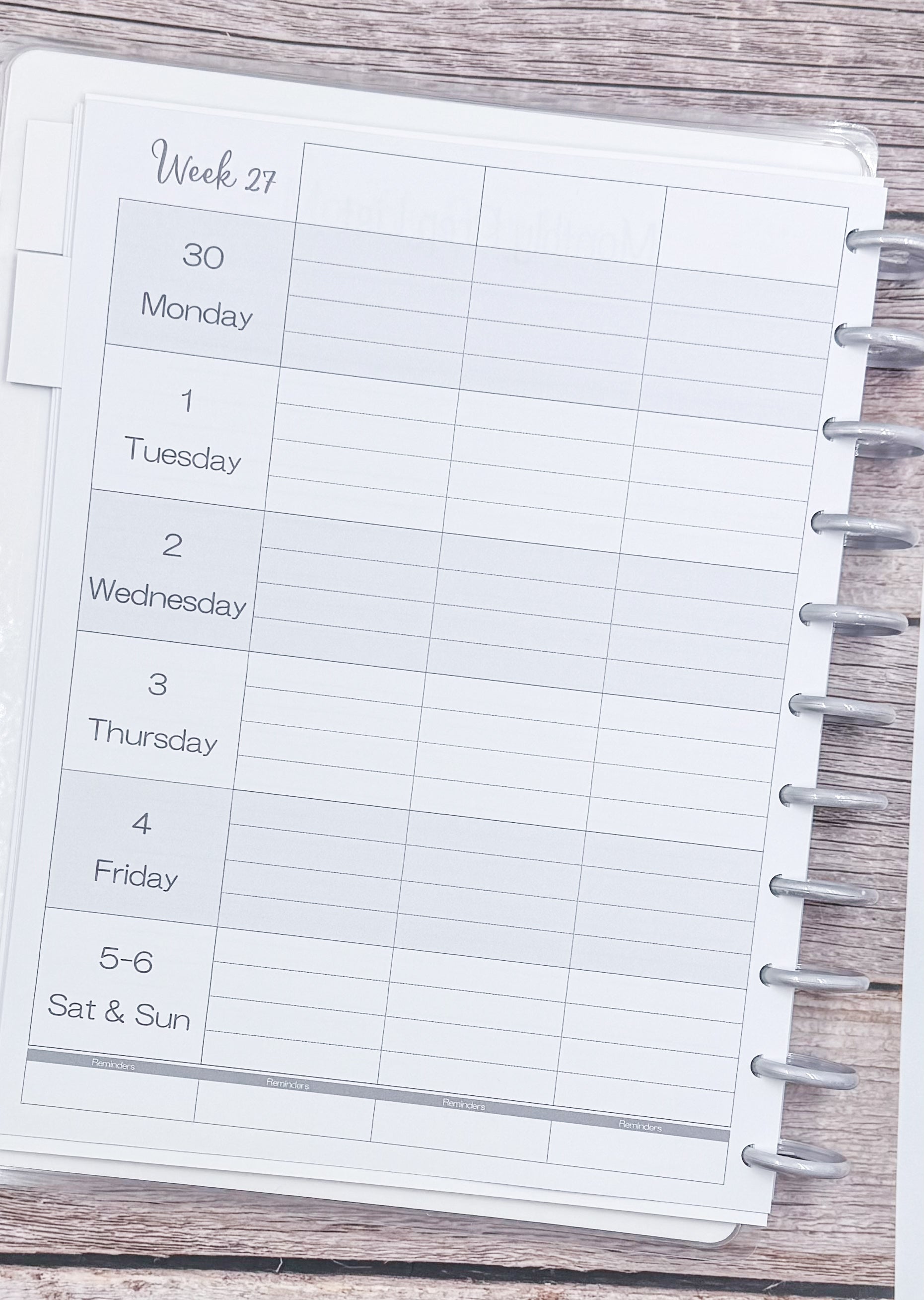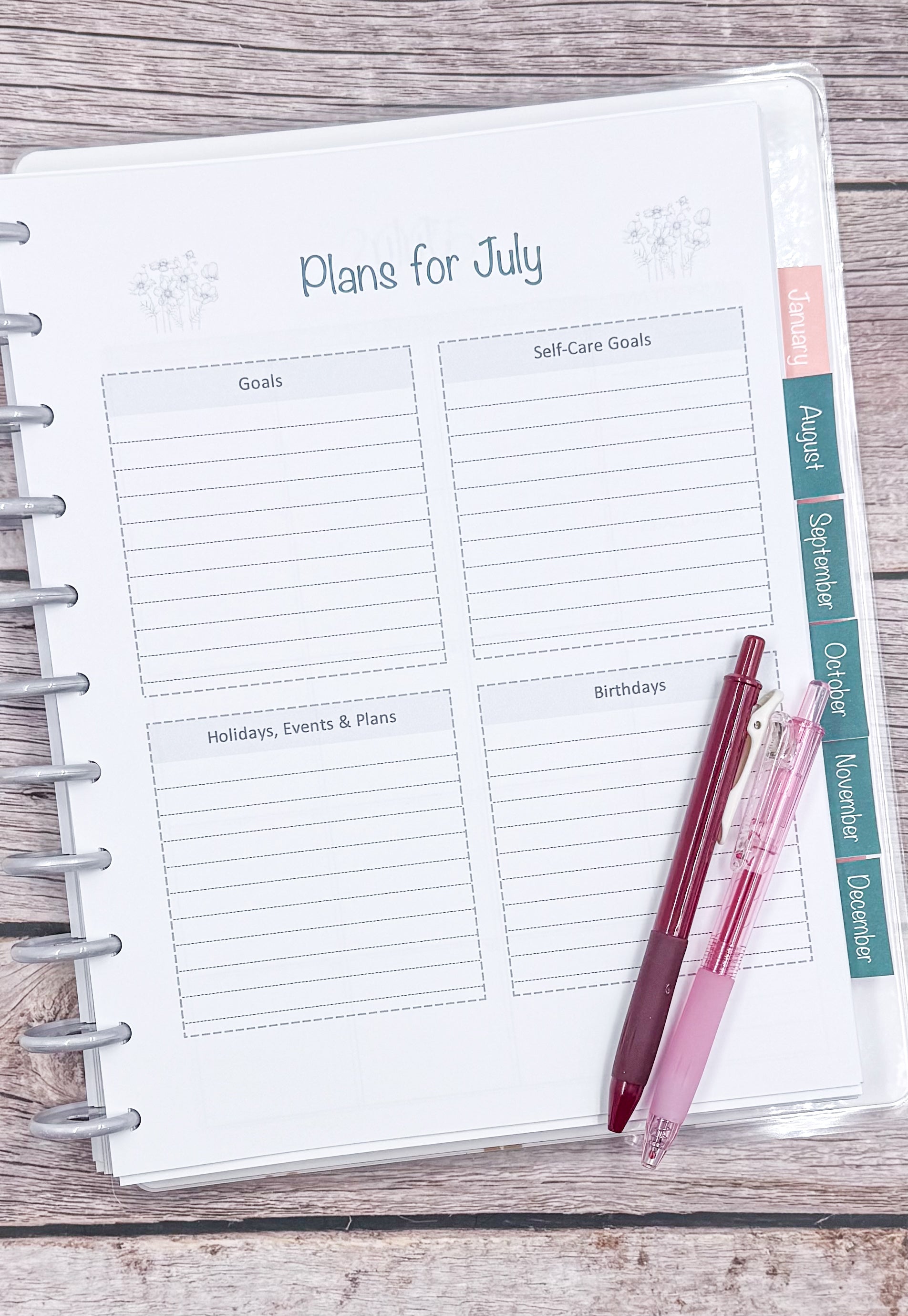 Spreads: Planning section, Monthly, Monthly + Weekly Vertical, Monthly Prep lists