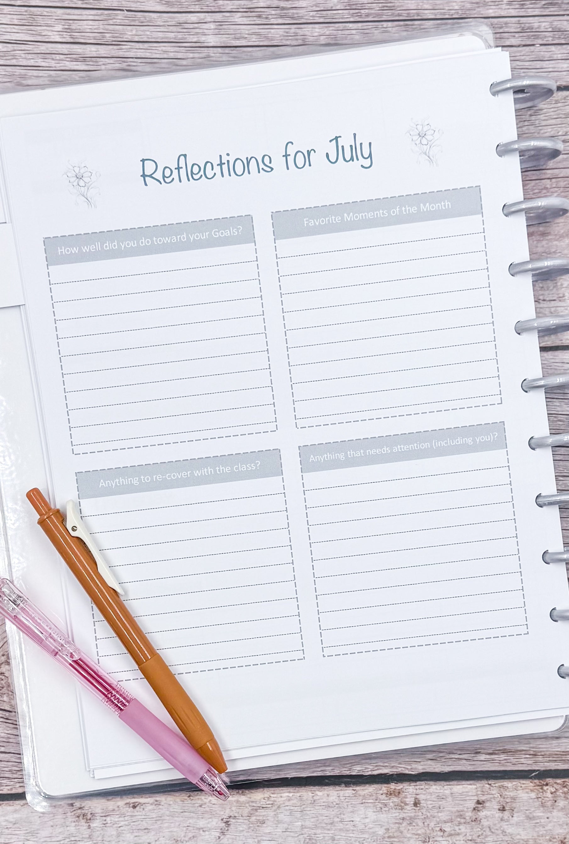 Teacher Add-ins: Year-at-a-Glance, Student Birthdays, Assignment Trackers, Communication Logs, Password Reminders, Monthly Reset (for some self-care), Teacher Planning and Goals Section, Teacher Reflection Section