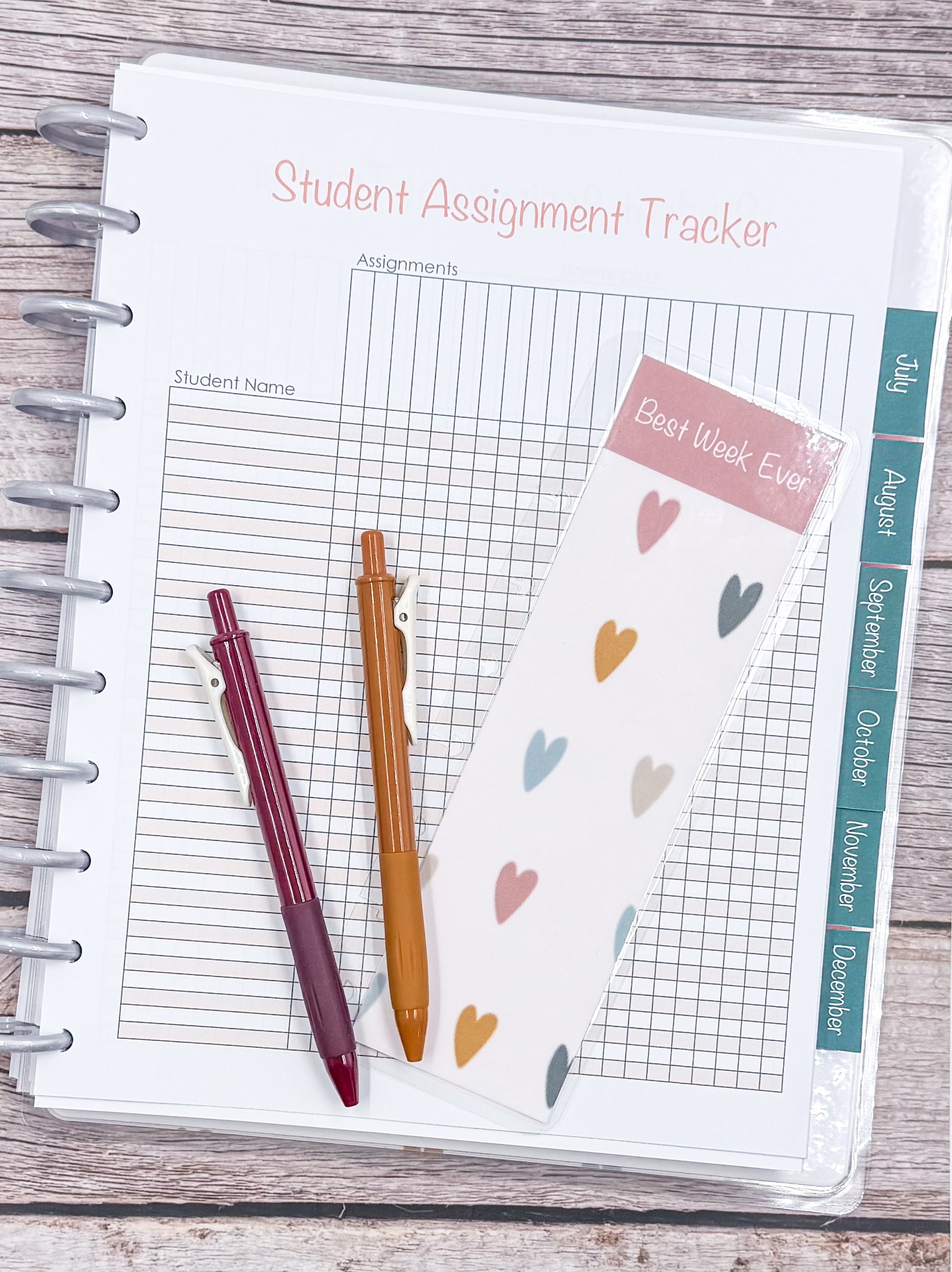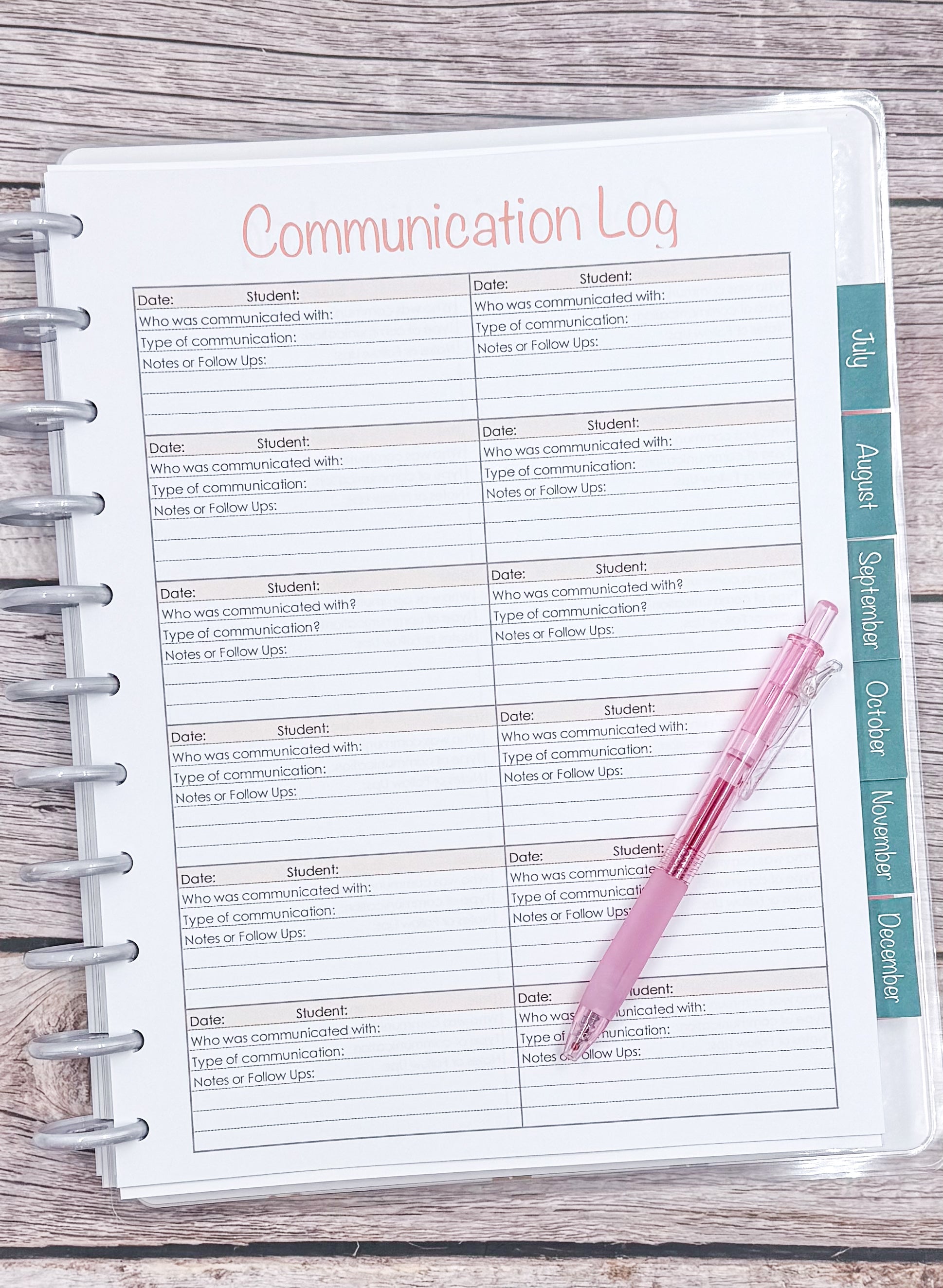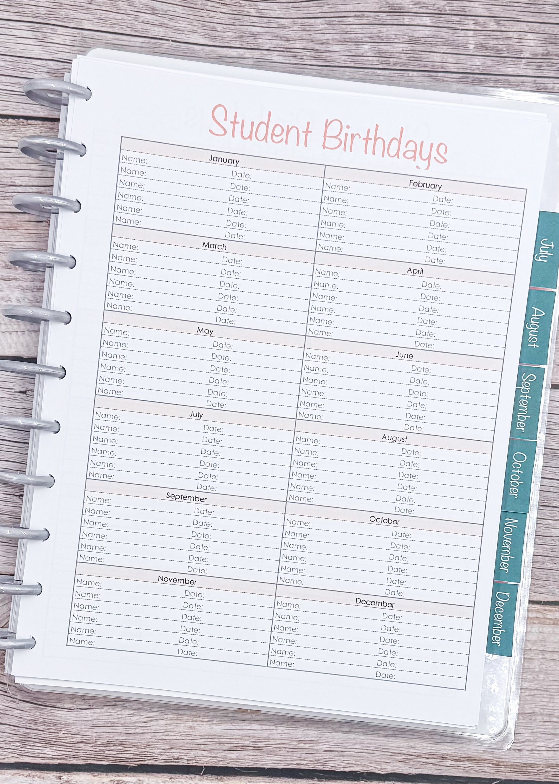 Inside, you’ll find all the teacher-y goodness you need to stay on top of the school year: from a year-at-a-glance and student birthdays to assignment trackers, communication logs, and those sneaky password reminders.