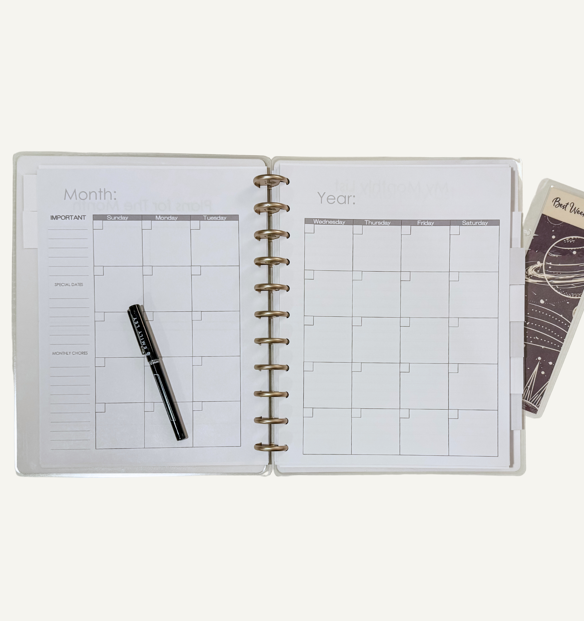 - Monthly spread with space for Important Call-outs, Special Dates, and Monthly Chores